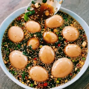 In una padella di piccole dimensioni, fai scaldare tutti gli altri ingredienti a fuoco lento eccetto la birra, dunque rimuovi dal fuoco e fai raffreddare fino a temperatura ambiente. Dopo di che, metti tutto in una ciotola e unisci le uova e la birra. Fai marinare in frigorifero per 24-48 ore, girando di tanto in tanto.